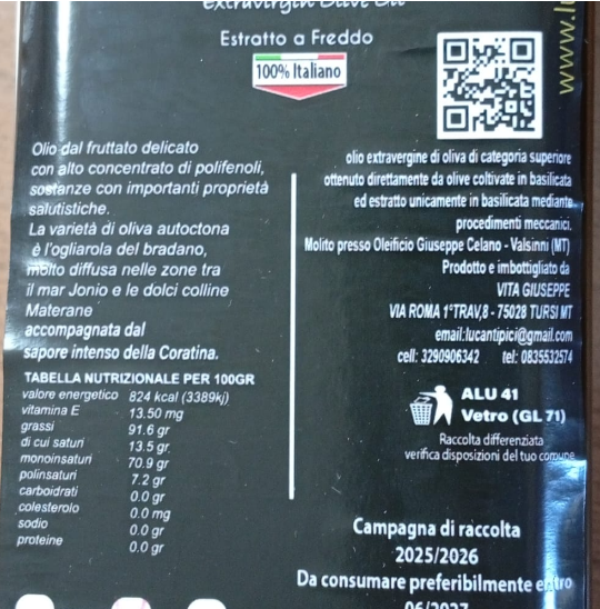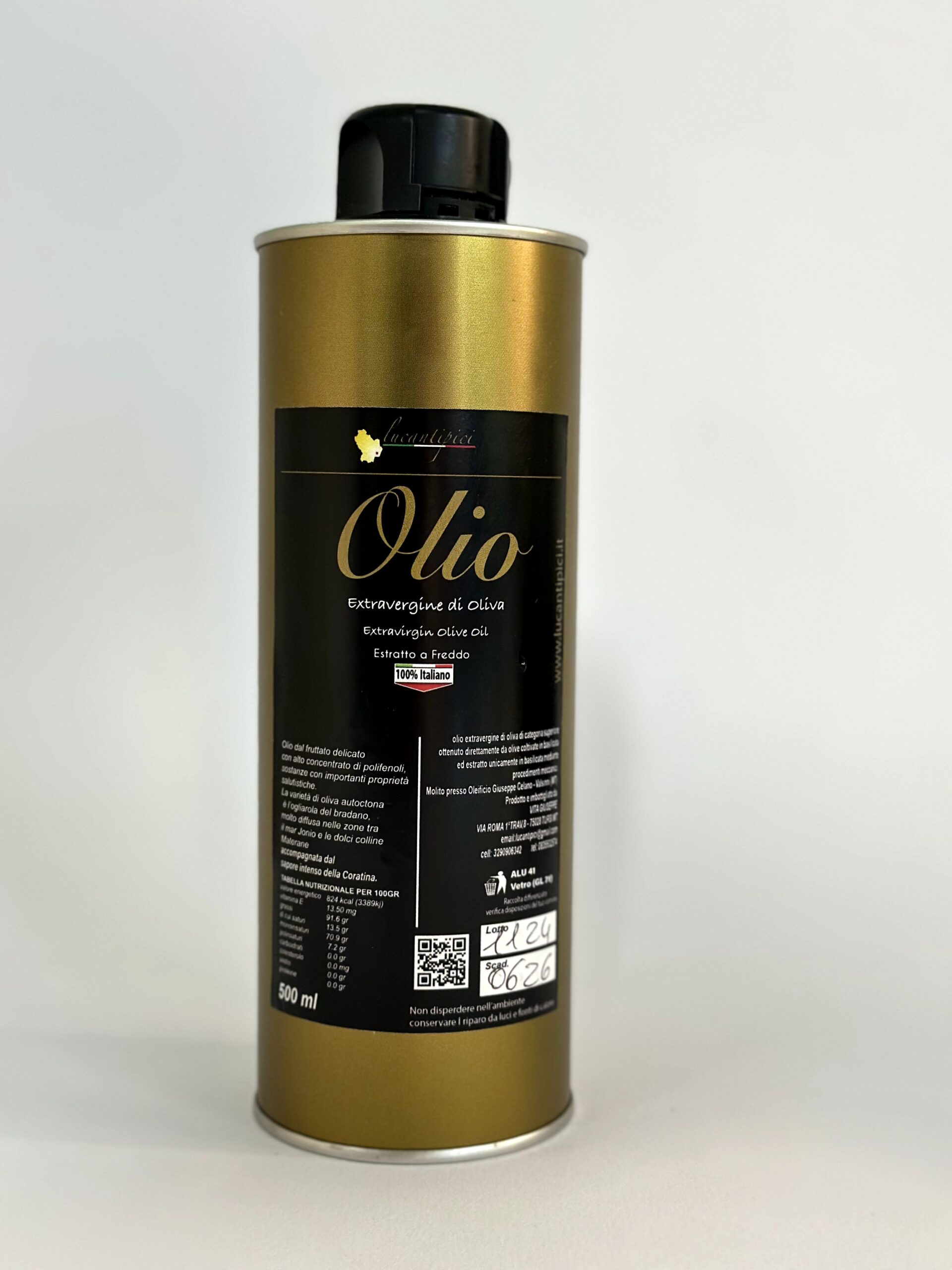 Olio Extravergine d’Oliva 100% Lucano. Estratto a freddo con procedimenti meccanici. Fruttato e delicato con alto contenuto di polifenoli, derivato da piante autoctone sulle colline del materano.